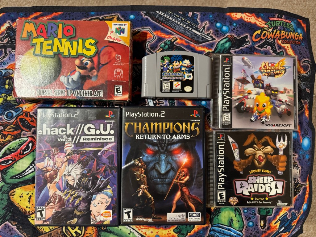 Last but not least, these games came from a visit to Retro World Games in Indian Orchard, MA. The big one here is Goemon’s Great Adventure for the Nintendo 64, a game that I legit didn’t think I’d ever own. I’ve heard interesting things about it, but I never saw it in the wild– until this visit. It was pricey (over $120), but in line with market value. Also for the Nintendo 64 comes a complete-in-box copy of Mario Tennis. I enjoy both Mario Tennis and Mario Golf for the console, but my loose copy of Mario Tennis is also a Not For Resale variant and I didn’t have a regular cartridge. I landed a pair of original PlayStation games, in Looney Tunes: Sheep Raider and Chocobo Racing. Sheep Raider is a game that I had skipped for awhile, but watching/reading reviews online made me rethink that decision. I’m a Looney Tunes guy, too, so I’m sure I’ll find something cool. Chocobo Racing is an upgrade to the disc-only copy I’ve had for a few years now. Finally, there’s a pair of PlayStation 2 games here that are, again, upgrades. .hack//G.U. Reminisce upgrades my disc-only copy that I picked up way back in 2011. It also completes my .hack set, as I now have both series fully complete. And then there’s Champions: Return to Arms. I absolutely need to spend some time in the Retro Room soon to replay both of the Champions games in the series, both of which are really fun hack & slash games. Return to Arms allows you to use your created character from the first game and has some other nifty features. This copy is pristine– and will go nicely with the formerly sealed/never-played copy of Champions of Norrath.