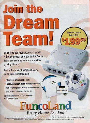 So I went all in on Dreamcast. Like… more than $700 in 1999 money. I preordered so much stuff— the console, some VMUs, an extra controller, and an unusually large number of launch games. My FuncoLand employee discount helped a little, but it was more paying a little every week and trading in a ton of stuff. I was as committed as I could be, and I happily spread the gospel of Dreamcast to customers in my FuncoLand store. Yeah, the PlayStation 2 loomed large on the distant horizon, but Dreamcast was a lot closer and sure seemed competitive.